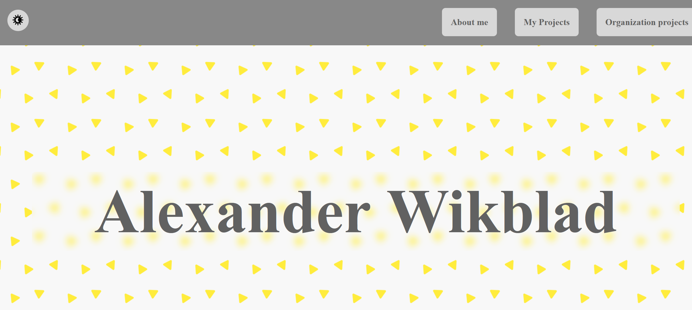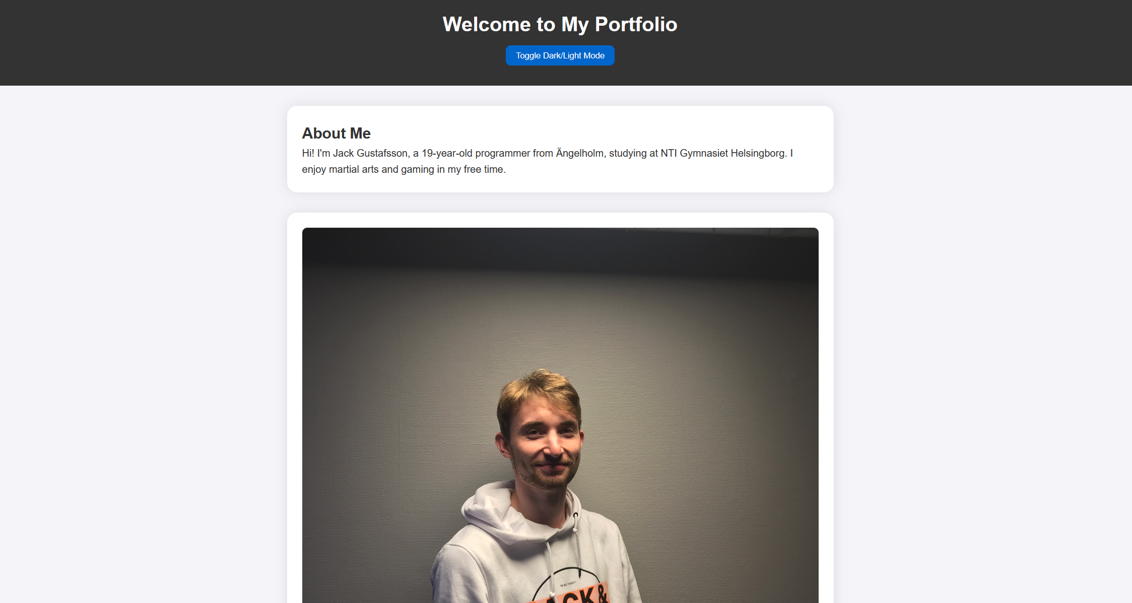 Här skapade vi våra egna portfoliohemsidor där vi kunde presentera oss själva och visa upp de projekt vi har arbetat med. Uppgiften gick ut på att bygga en enkel portfolio med hjälp av GitHub Pages – ett verktyg som gör det möjligt att publicera webbsidor direkt från en GitHub-repo. Syftet var att ge eleverna en plattform där de på ett enkelt sätt kan samla och visa sina arbeten. Hemsidan byggdes med HTML, CSS och enklare JavaScript-funktioner, exempelvis en knapp för att växla mellan olika bakgrundsfärger, som att aktivera ett mörkt läge (dark mode). Varje portfolio innehåller en kort presentation av eleven och en sektion med “placeholders” där framtida projekt kan läggas in. Fokus låg på att skapa en tydlig och hållbar struktur som kan byggas ut och fyllas på med mer innehåll under kursens gång.